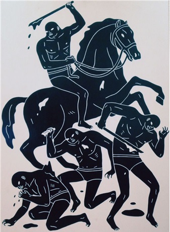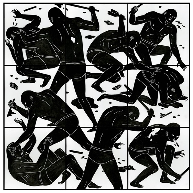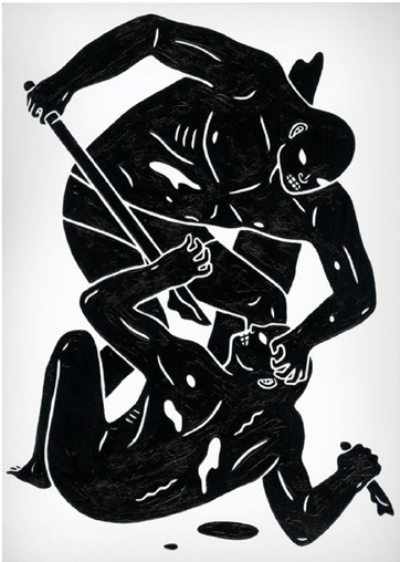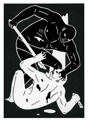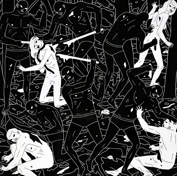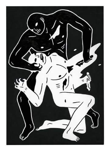 Cleon Peterson’s shadowy figures mete out violence in images that could just as well depict justice as they do barbarity. Peterson’s work can be viewed as both a continuation and a progression of past works, in which graphically rendered scenes of sadism portray chaos as the inevitable order of things. Many of those scenes have featured characters with physical appearances largely undifferentiated from one another, suggesting a classless unsympathetic society, yet in this new body of work Peterson incorporates “shadow” figures and a new dichotomous order. There are haves and have-nots, but amid the havoc it’s hard to decide who’s who.