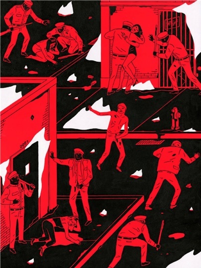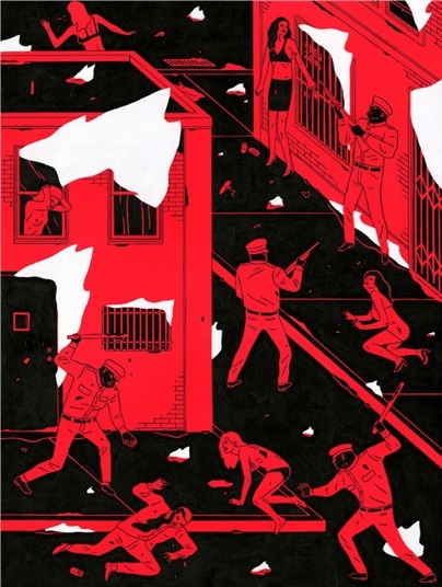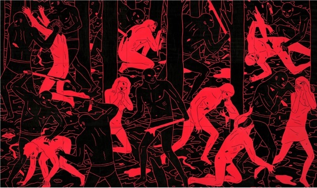 In Cleon Peterson’s End of Days, opening February 22nd at New Image Art, Peterson’s world of depravity does not simply crash and burn: it reverses polarity, inherited not by the meek but by the vengeful and merciless. Whatever days have ended, they have been succeeded by a new age of barbarism, with clear winners and losers. The triumphant take no trophies, apart from the occasional severed head, but the defeated have clearly lost more than their viscera – they have lost all semblance of control, dignity, strength and, most of all, hope.